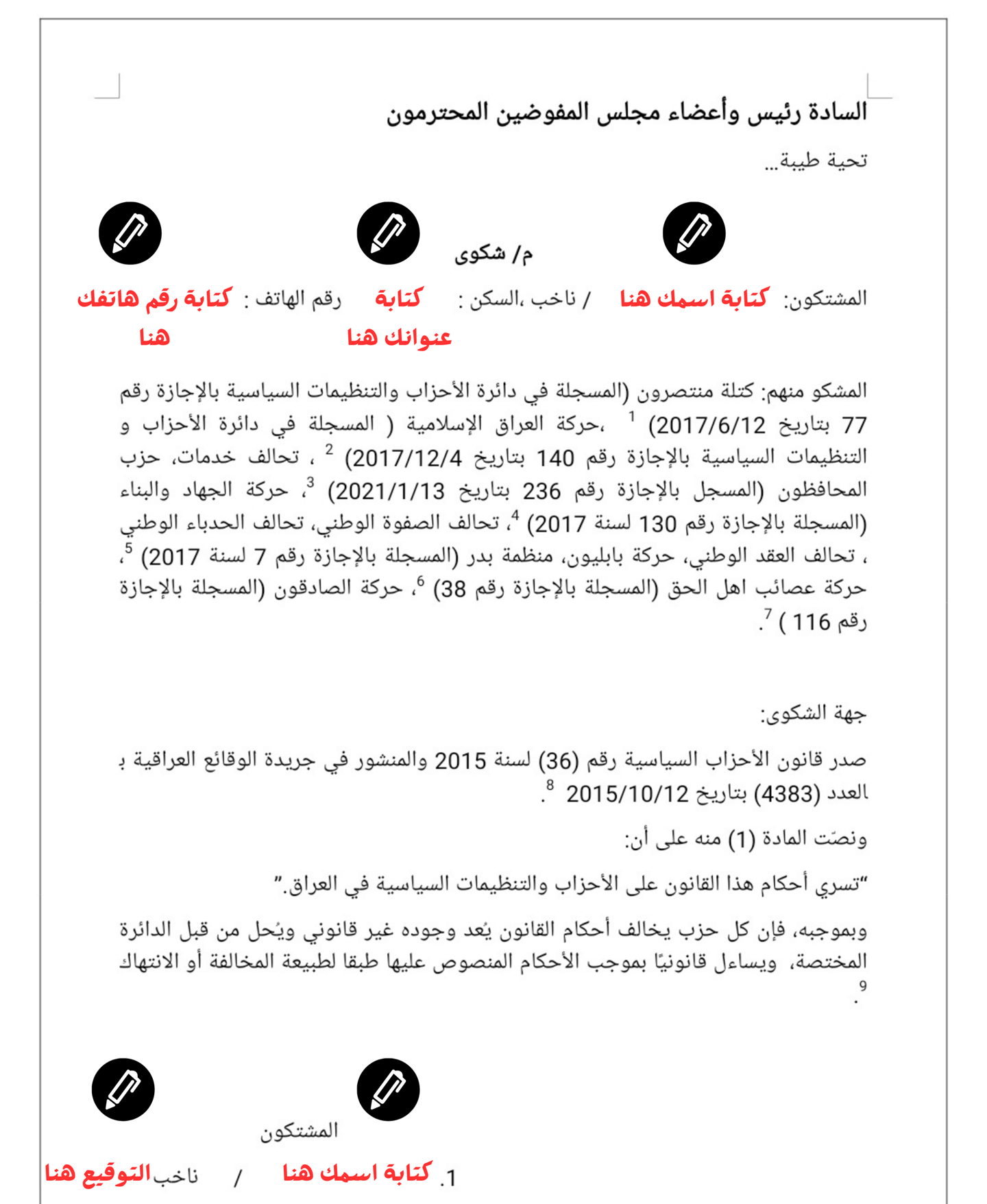 1.إضافة أسماء المشتكين. 2.كتابة العناوين. 3.تحديد الصفة (ناخب). كما هو موضح في الصور في الاسفل