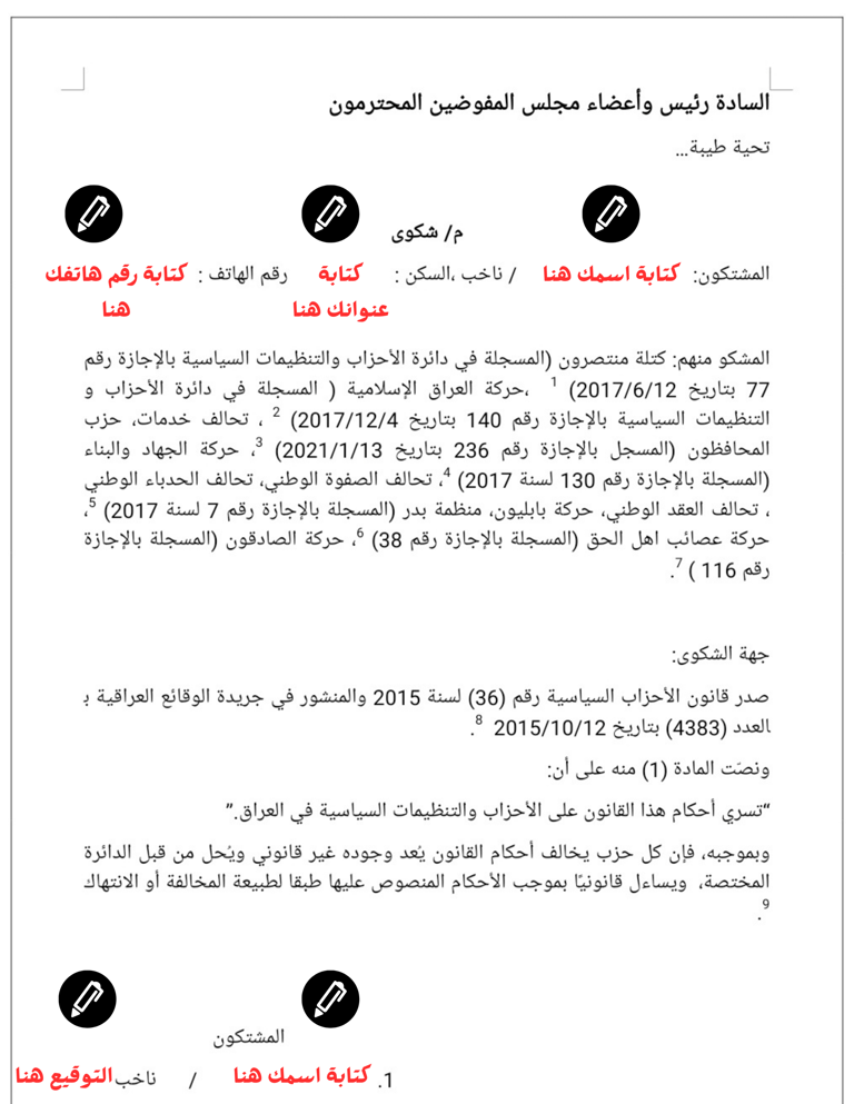 انطلاقًا من قناعة ثابتة بأن التغيير لا يتحقق عبر المساومات مع قوى السلاح المنفلت أو عبر شعارات لا تُترجم إلى فعل، ومن منطلق مسؤوليتنا في الدفاع عن حق المواطن بالعيش الكريم في ظل دولة مواطنة يسودها القانون، بادرنا بتاريخ 27/8/2025 بتقديم شكاوى رسمية إلى المفوضية العليا المستقلة للانتخابات ودائرة الأحزاب والتنظيمات السياسية ضد جميع الأحزاب التي تمتلك تشكيلات مسلّحة، بوصف ذلك مخالفة صريحة لأحكام الدستور وقانون الأحزاب السياسية النافذ.